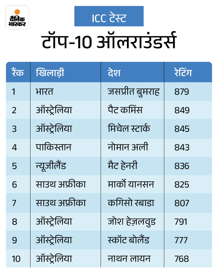 स्टार्क को ऑलराउंडर्स रैंकिंग में भी फायदा मिचेल स्टार्क को टेस्ट ऑलराउंडर्स रैंकिंग में भी फायदा मिला है। एडिलेड टेस्ट में अहम अर्धशतक लगाने के बाद वे तीसरे नंबर पर पहुंच गए हैं। स्टार्क के 311 रेटिंग पॉइंट्स हैं और वे इंग्लैंड के बेन स्टोक्स के बराबर हो गए हैं।