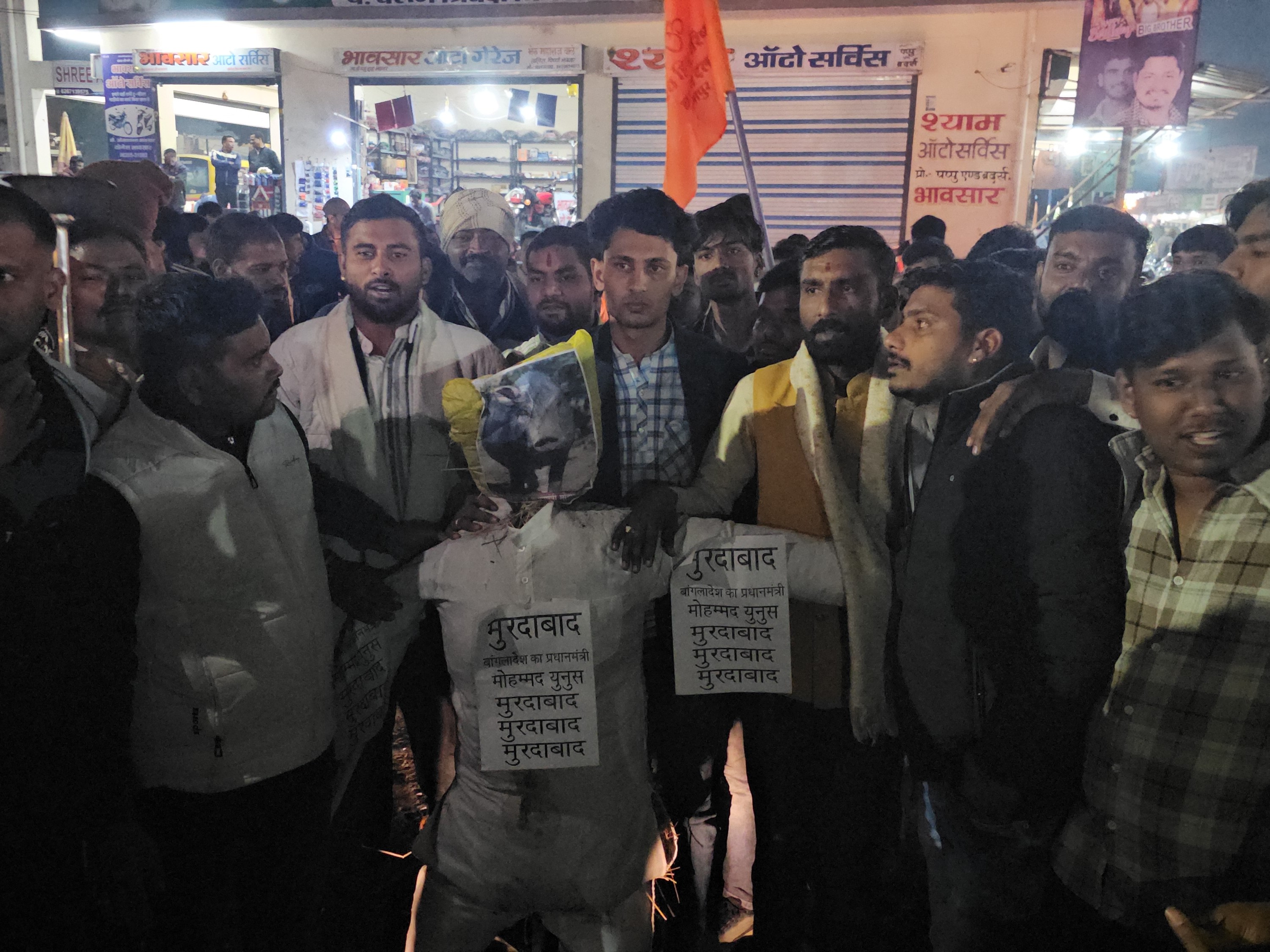 मशाल जुलूस के बाद फव्वारा चौराहे पर बांग्लादेश के वर्तमान शासक का पुतला जलाया गया। प्रदर्शनकारियों ने साफ शब्दों में कहा कि पड़ोसी देश में हिंदुओं के साथ जो हो रहा है, वह पूरी मानवता के खिलाफ है और इसे किसी भी कीमत पर बर्दाश्त नहीं किया जाएगा।