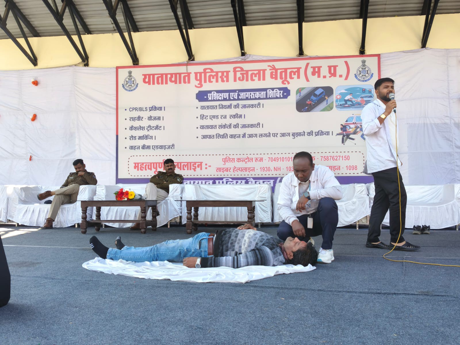 जिला अस्पताल के डॉक्टरों ने CPR की ट्रेनिंग दी बढ़ते सड़क हादसों को देखते हुए, शुक्रवार को यातायात पुलिस बैतूल ने ऑडिटोरियम में वाहन चालकों के लिए एक यातायात जागरूकता शिविर का आयोजन किया। इस शिविर का मुख्य उद्देश्य वाहन चालकों को सड़क सुरक्षा, यातायात नियमों के पालन और हेलमेट व सीट बेल्ट के महत्व के प्रति जागरूक करना था।