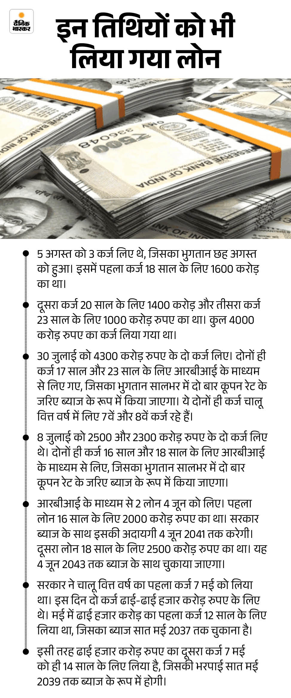 मोहन सरकार का आज लिया गया पहला कर्ज 1200 करोड़ रुपए का है जो 5 साल के लिए है और इसका ब्याज के साथ सरकार 31 दिसम्बर 2030 तक भुगतान करेगी। इस राशि से कृषि योजनाओं, सिंचाई और पावर प्रोजेक्ट्स, कम्युनिटी डेवलपमेंट प्रोजेक्ट्स में काम होगा। दूसरा लोन 11 साल के लिए लिया जा रहा है। इस कर्ज की राशि भी 1200 करोड़ रुपए है जो 31 दिसम्बर 2036 तक के लिए है। तीसरा कर्ज 1100 करोड़ रुपए का है जो 23 साल की अवधि में ब्याज के साथ चुकता किया जाएगा। डिप्टी सीएम और वित्त मंत्री जगदीश देवड़ा बार-बार कर्ज लिए जाने को लेकर इसी माह स्पष्ट कर चुके हैं कि कर्ज नहीं यह निवेश है और यह कर्ज प्रदेश में विकास कार्यों, इंफ्रास्ट्रक्चर डेवलपमेंट की खातिर लिया जाता है और इसी में उसका उपयोग होता है।