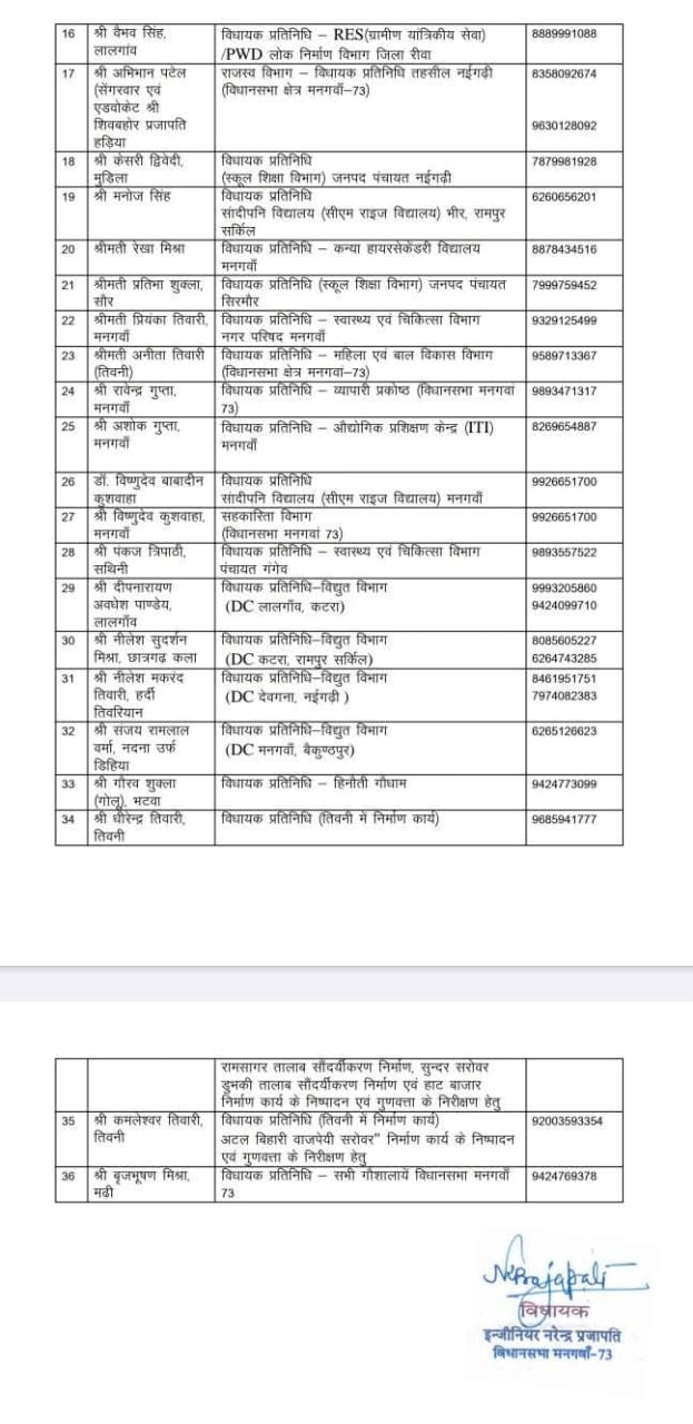 लगभग हर विभाग के लिए अलग विधायक प्रतिनिधि तय किए गए हैं। इस पूरे मामले पर विधायक नरेंद्र प्रजापति की ओर से कहा गया है कि“विधानसभा क्षेत्र बड़ा है, समस्याएं भी व्यापक हैं। हर विभाग में प्रतिनिधि होने से जनता की शिकायतों का समाधान तेजी से हो सकेगा और कामकाज पर सीधी निगरानी रहेगी।