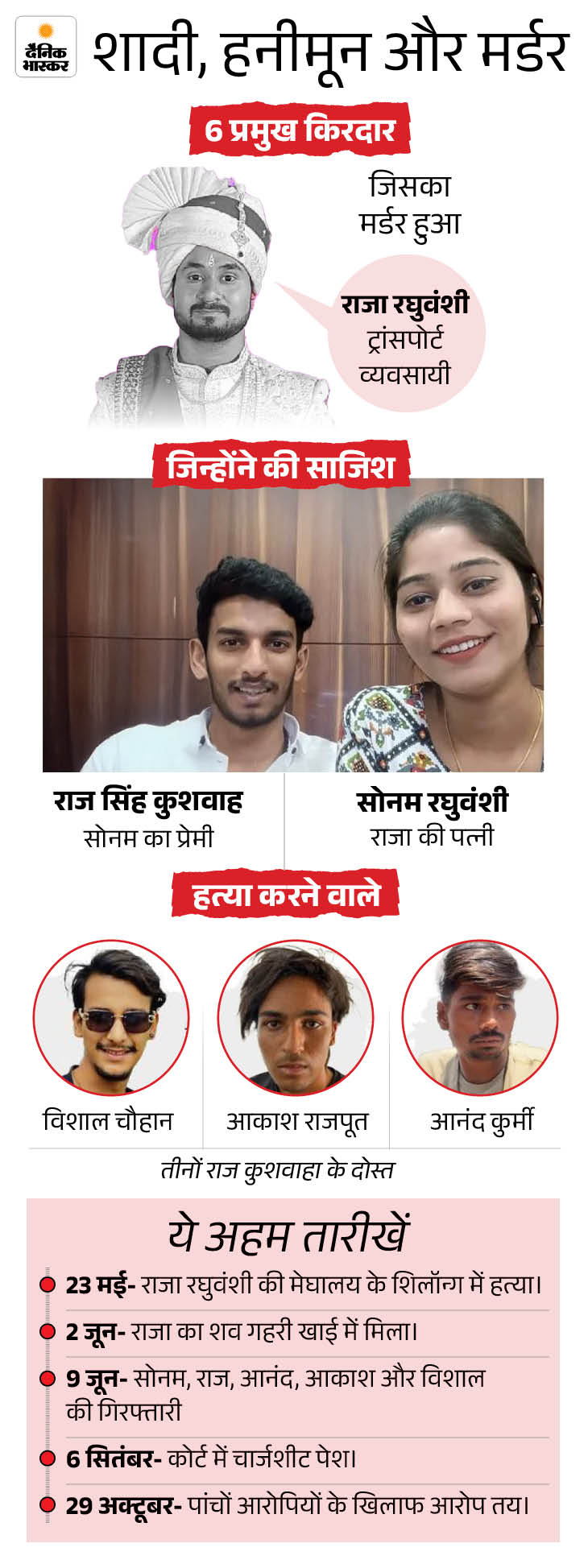 इनमें आकाश राजपूत, विशाल चौहान और आनंद कुर्मी शामिल हैं। राजा की हत्या के सभी आरोपी शिलॉन्ग जेल में हैं।