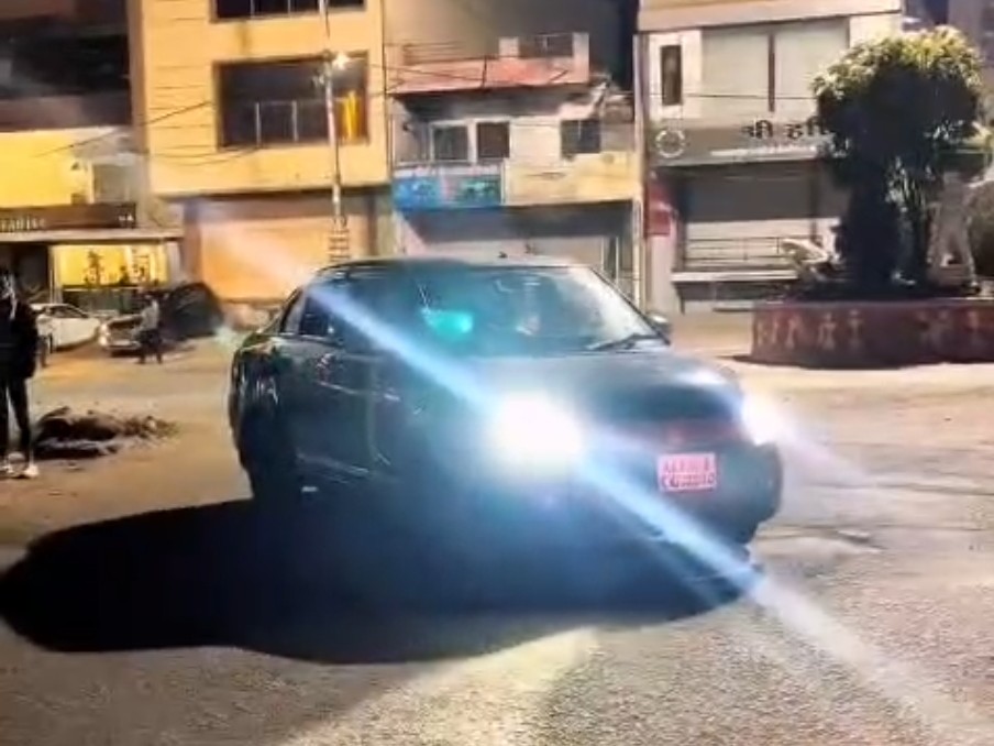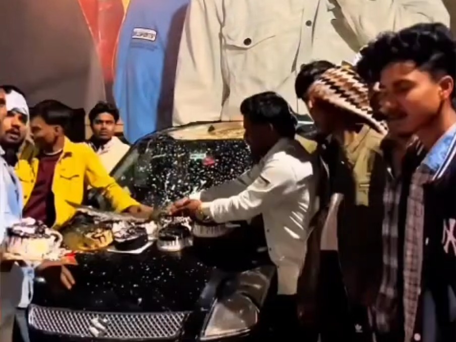 कार के बोनट पर केक रखकर तलवार से काटता युवक।