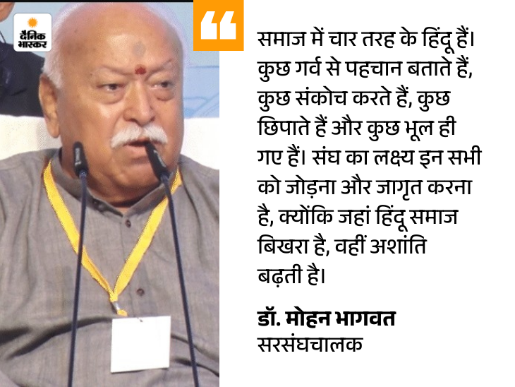 भोपाल में राष्ट्रीय स्वयंसेवक संघ के शताब्दी वर्ष के मौके पर शुक्रवार को ‘प्रमुख जन गोष्ठी’ आयोजित की गई। जिसे संबोधित करते हुए सरसंघचालक डॉ. मोहन भागवत ने कहा कि हमारे मत-पंथ, संप्रदाय, भाषा और जाति अलग हो सकती है, लेकिन हिंदू पहचान हम सबको जोड़ती ह