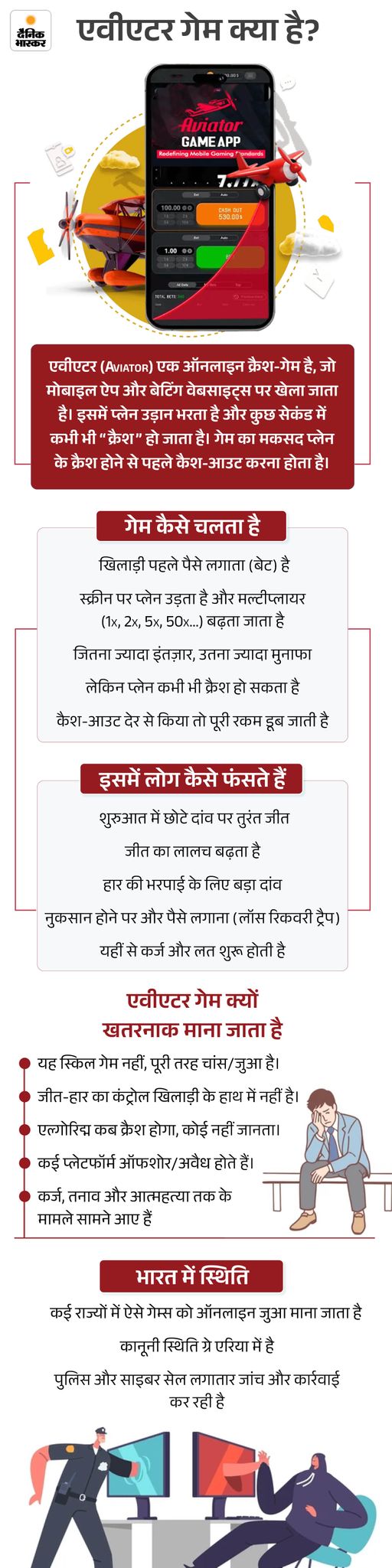 - एविएटर गेम: इसमें एक हवाई जहाज को उड़ते हुए दिखाया जाता है। यूजर उड़ान शुरू होने पर पैसा लगाते हैं, और प्लेन जितनी देर हवा में रहता है, पैसा उतने गुना बढ़ता जाता है। लेकिन यह प्लेन कभी भी, बिना किसी चेतावनी के क्रैश हो जाता है। शर्त यह होती है कि यूजर को प्लेन क्रैश होने से ठीक पहले अपना पैसा निकालना होता है।