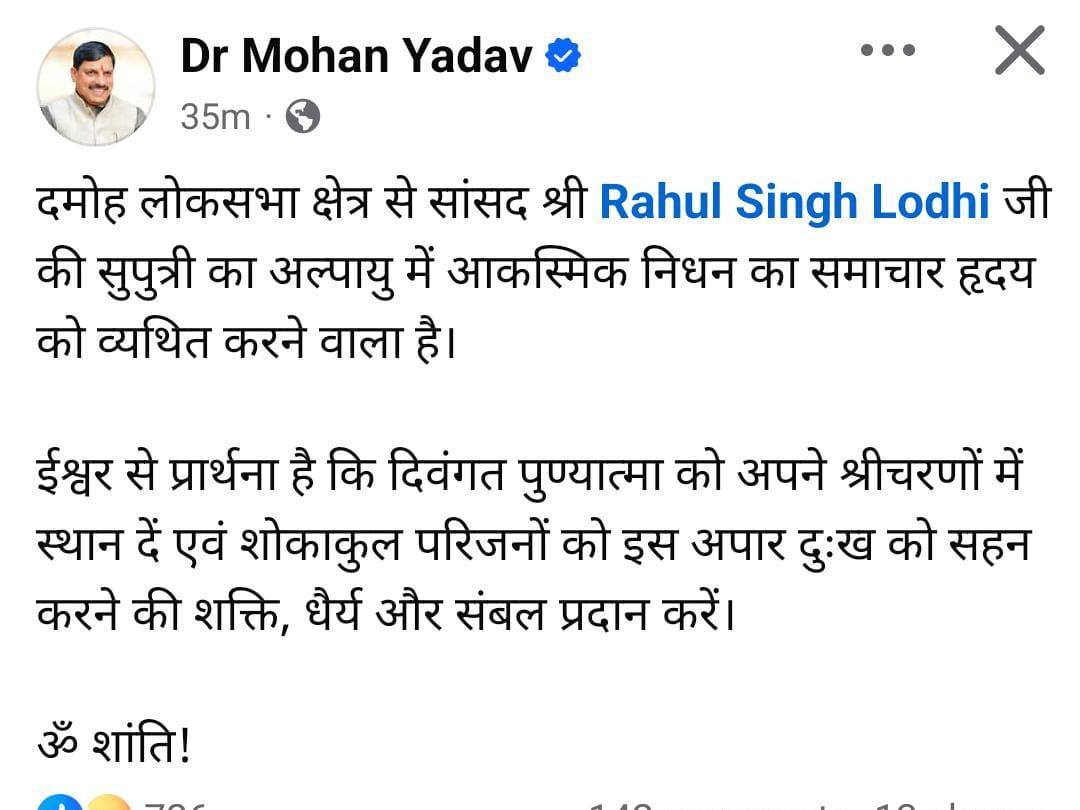 दमोह सांसद राहुल सिंह लोधी की 6 वर्षीय बेटी संस्था सिंह का रविवार रात दिल्ली के एम्स (AIIMS) अस्पताल में निधन हो गया। वह बचपन से ही बीमार थीं और लंबे समय से उनका इलाज चल रहा था।