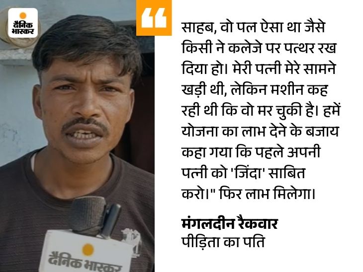 ये आपबीती है मंगलदीन रैकवार और उसकी पत्नी गीता रैकवार की। छतरपुर जिले में खजुराहो के इकलगांव के रहने वाले हैं। गीता को छह माह का गर्भ है। उसे इलाज भी कराना है। गीता को सरकारी रिकॉर्ड में मृत बता दिया है यानी कागजों में वह इस दुनिया में नहीं है।