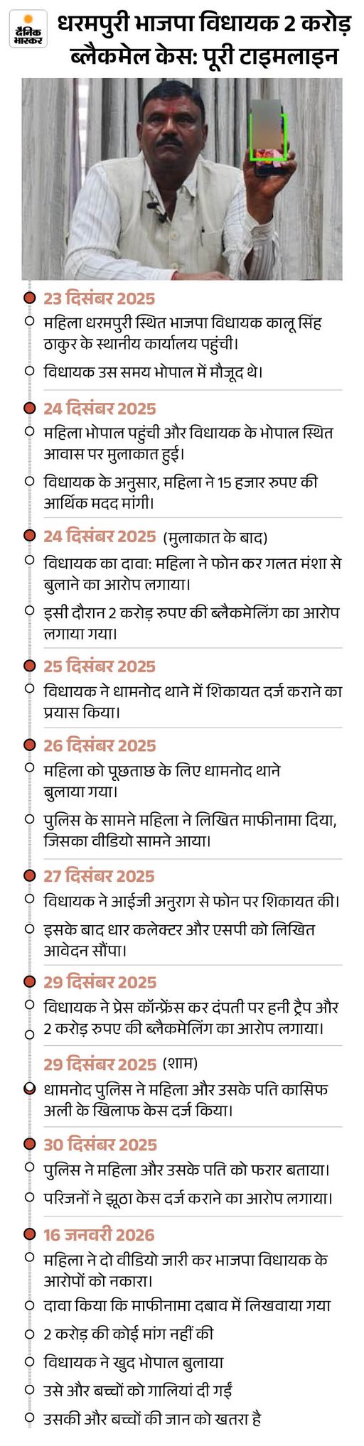 2. विधायक पर ब्लैकमेलिंग का आरोप, महिला-पति पर केस दर्ज धार जिले में भाजपा विधायक कालू सिंह ठाकुर ने एक महिला और उसके पति कासिफ अली पर ब्लैकमेलिंग और अवैध वसूली का आरोप लगाया है। विधायक का कहना है कि दोनों ने उनसे 2 करोड़ रुपए और एक गाड़ी की मांग की और झूठी एफआईआर व मेडिकल रिपोर्ट की धमकी दी। पढ़ें पूरी खबर…