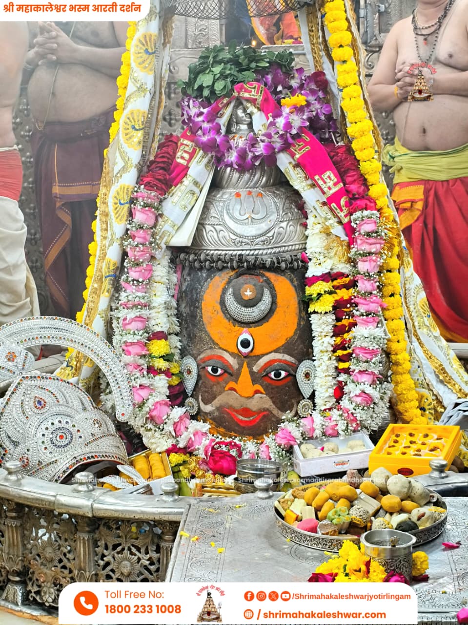 श्रृंगार पूर्ण होने के बाद ज्योतिर्लिंग को वस्त्र से आच्छादित कर भस्म रमाई गई। भस्म अर्पण के पश्चात भगवान को शेषनाग का रजत मुकुट, रजत मुंडमाल, रुद्राक्ष की माला तथा सुगंधित पुष्पों से बनी फूलों की मालाएं अर्पित की गईं। भगवान महाकाल को मोगरे और गुलाब के सुगंधित पुष्प धारण कराए गए।