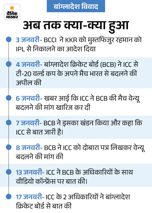 एक दिन पहले क्रिकेट वेबसाइज क्रिकइंफो ने लिखा था कि ICC ने बांग्लादेश क्रिकेट बोर्ड (BCB) को 21 जनवरी तक यह तय करने को कहा है कि उसकी टीम वर्ल्ड कप खेलेगी या नहीं। हालांकि, इस पूरे मामले पर ICC ने कोई अधिकृत बयान जारी नहीं किया है।