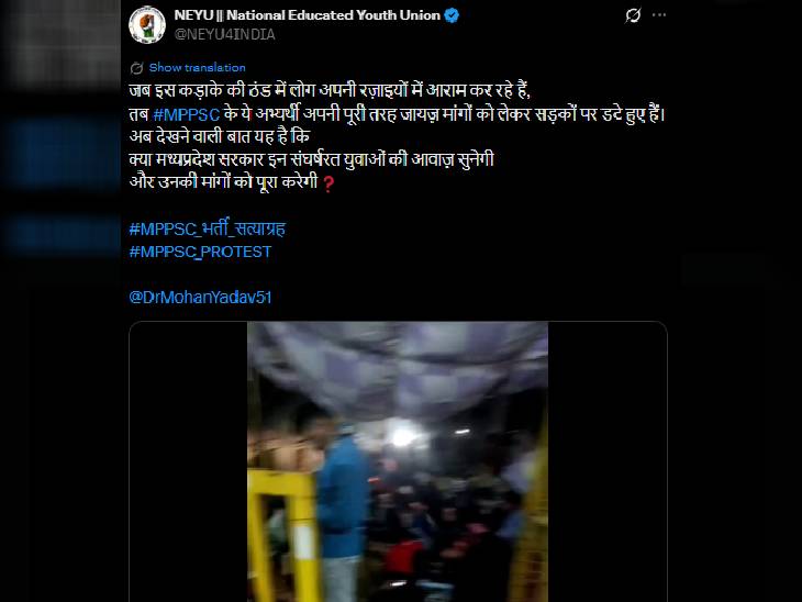 इंदौर में मध्यप्रदेश लोक सेवा आयोग (MPPSC) के सामने अभ्यर्थियों ने एक बार फिर शनिवार देर रात से आंदोलन शुरू कर दिया है। कोर्ट की अनुमति मिलने के बाद नेशनल एजुकेटेड यूथ यूनियन (NEYU) के नेतृत्व में आयोग कार्यालय के बाहर धरना दिया जा रहा है। 10 सूत्री