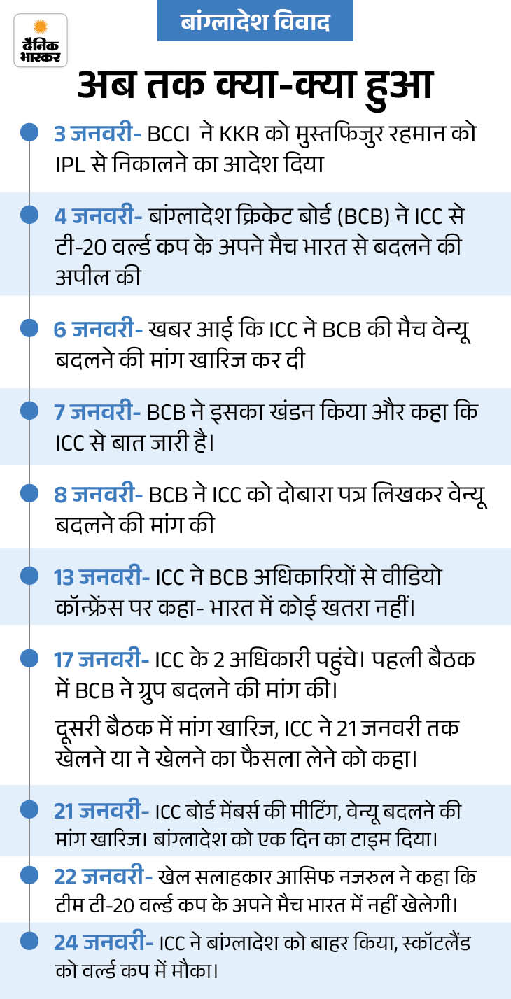 बांग्लादेश क्रिकेट बोर्ड (BCB) ने ICC से मांग की थी कि उनके मैच भारत से श्रीलंका में शिफ्ट कराए जाए। BCB ने सुरक्षा को लेकर चिंता जताई थी। हालांकि, ICC ने सुरक्षा का कोई खतरा नहीं बताया और बांग्लादेश को आखिर तक मनाने के बाद उन्हें हटाकर स्कॉटलैंड को मौका दे दिया।