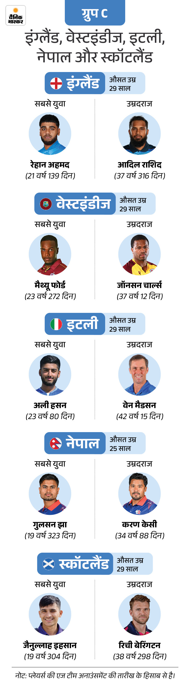 ग्रुप-सी: सबसे युवा ग्रुप, टीमों की औसत उम्र 30 से कम यह टूर्नामेंट का सबसे युवा ग्रुप है। इस ग्रुप में शामिल सभी टीमों की औसत उम्र 30 साल से कम है। इंग्लैंड, वेस्टइंडीज, इटली और स्कॉटलैंड की औसत उम्र 29 साल है। जबकि नेपाल की एवरेज एज 25 साल है। इस ग्रुप के 41 खिलाड़ी 30 साल से कम के हैं। इनमें दो प्लेयर्स 19-19 साल के हैं। 35 से 40 साल के बीच के 31 खिलाड़ी हैं। केवल एक खिलाड़ी 40 साल से ज्यादा का है।