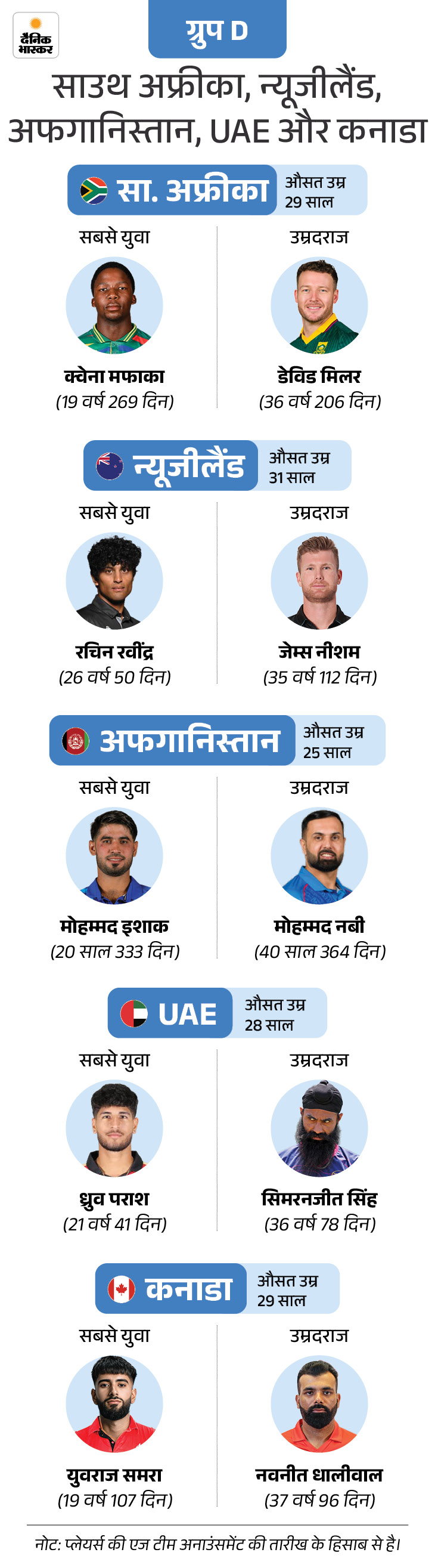 ग्रुप-डी: NZ उम्रदराज, 4 टीमों की एवरेज एज 30 से कम इस ग्रुप में 4 टीमों की एवरेज एज 30 साल से कम है। इनमें साउथ अफ्रीका, अफगानिस्तान, UAE और कनाडा शामिल हैं। न्यूजीलैंड ही इकलौती ऐसी टीम है, जिसकी औसत आयु 30 पार है। 31 साल की एवरेज एज वाली न्यूजीलैंड इस टूर्नामेंट की सबसे उम्रदराज टीमों में शामिल हैं।