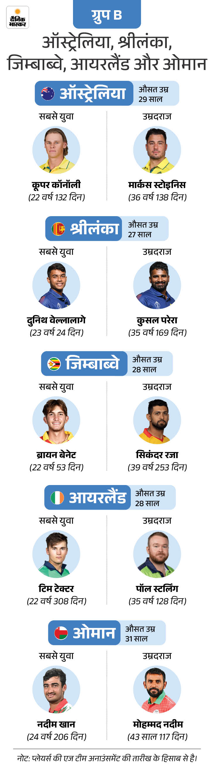 ग्रुप-बी: ओमान सबसे उम्रदराज, नदीम 43 साल के हैं 75 खिलाड़ियों के इस ग्रुप में सबसे ज्यादा 26 खिलाड़ी 25 से 30 साल के बीच के हैं। सबसे कम 11 खिलाड़ी 35 से 40 साल के हैं। एक प्लेयर ने 40 साल की उम्र पार कर ली है। इस ग्रुप में सबसे उम्रदराज टीम ओमान है, जिसकी औसत उम्र 31 साल है। वहीं, ऑस्ट्रेलिया की औसत उम्र 30 साल है। श्रीलंका की औसत उम्र सबसे कम 27 साल है।