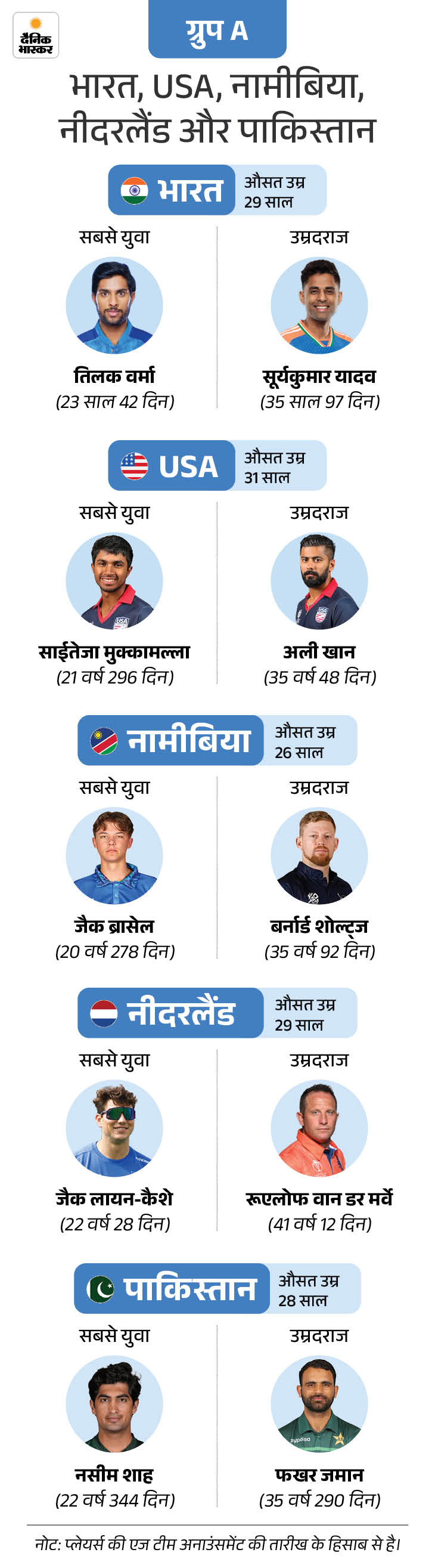 ग्रुप-ए: USA सबसे उम्रदराज; भारत के 8 खिलाड़ी 30+ इस ग्रुप में USA सबसे उम्रदराज है, जबकि नामीबिया की टीम सबसे युवा है। USA की औसत उम्र 31 साल है, जबकि नामीबिया की महज 26 साल है। इस ग्रुप में 75 खिलाड़ी हैं, इनमें से 32 प्लेयर्स 30 से 35 साल के बीच हैं। 32 ही प्लेयर्स 35 से 40 साल के हैं। सिर्फ एक प्लेयर 40 साल से ज्यादा का है।