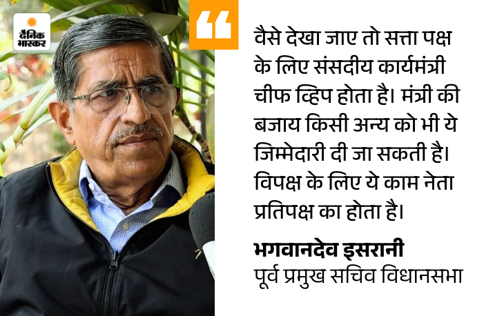 विधानसभा के पूर्व प्रमुख सचिव भगवान देव इसराणी कहते हैं कि चीफ व्हिप की जरूरत हर विधानसभा में होती है। ज्यादातर राज्यों ने अपनी विधानसभाओं में सदन की कार्यवाही को सुचारू रूप से चलाने और पार्टी अनुशासन बनाए रखने के लिए इस पद की व्यवस्था की है।