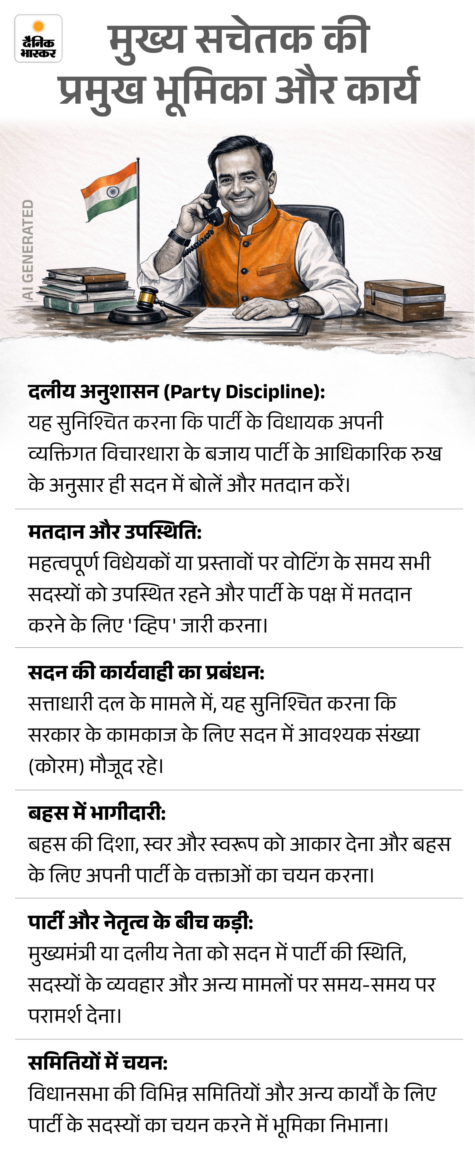 क्यों महत्वपूर्ण है मुख्य सचेतक का पद? विधानसभा या संसद में मुख्य सचेतक का पद केवल एक औपचारिक नियुक्ति नहीं है। यह किसी भी राजनीतिक दल का वह प्रमुख पदाधिकारी होता है, जो सदन के भीतर पार्टी के सभी सदस्यों को बांधकर रखता है। इसकी भूमिका पार्टी नेतृत्व और विधायकों के बीच एक पुल की तरह होती है।
