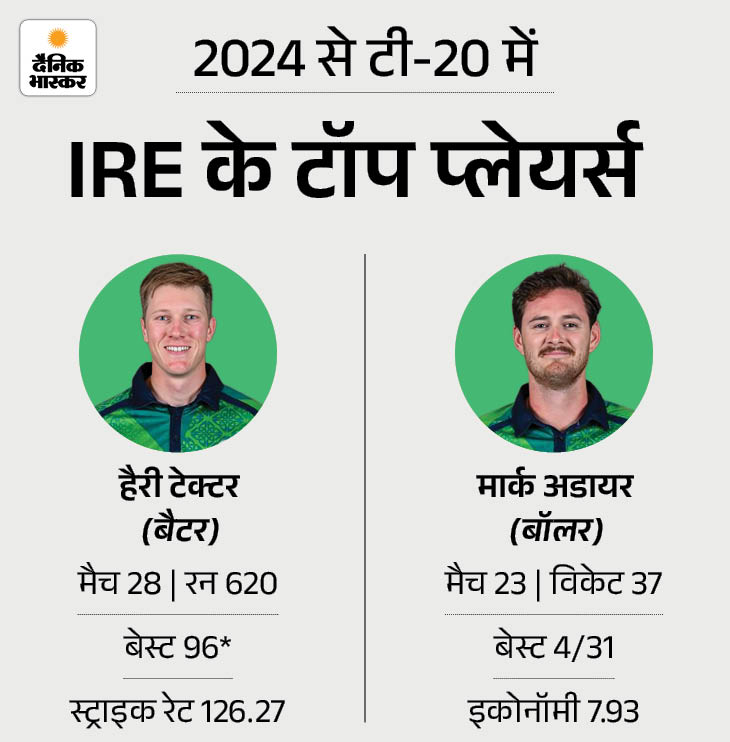 दबाव में है आयरलैंड आयरलैंड को पहले मुकाबले में श्रीलंका से 20 रन की हार का सामना करना पड़ा। तब हैरी टेक्टर ने 40 रन बनाए थे। जॉर्ज डॉकरेल ने शानदार गेंदबाजी करते हुए 4 ओवर में सिर्फ 17 रन देकर 2 विकेट लिए थे। 2024 के बाद से मार्क अडायर ने टीम के लिए सबसे ज्यादा विकेट लिए हैं।