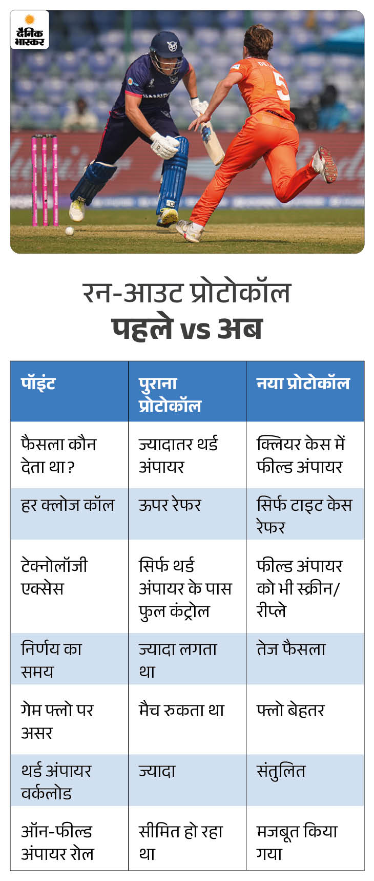टी-20 वर्ल्ड कप 2026 में अंपायरिंग से जुड़ा एक अहम बदलाव देखने को मिल रहा है। इस बार हर रन-आउट अपील के लिए थर्ड अंपायर की मदद नहीं ली जा रही है।