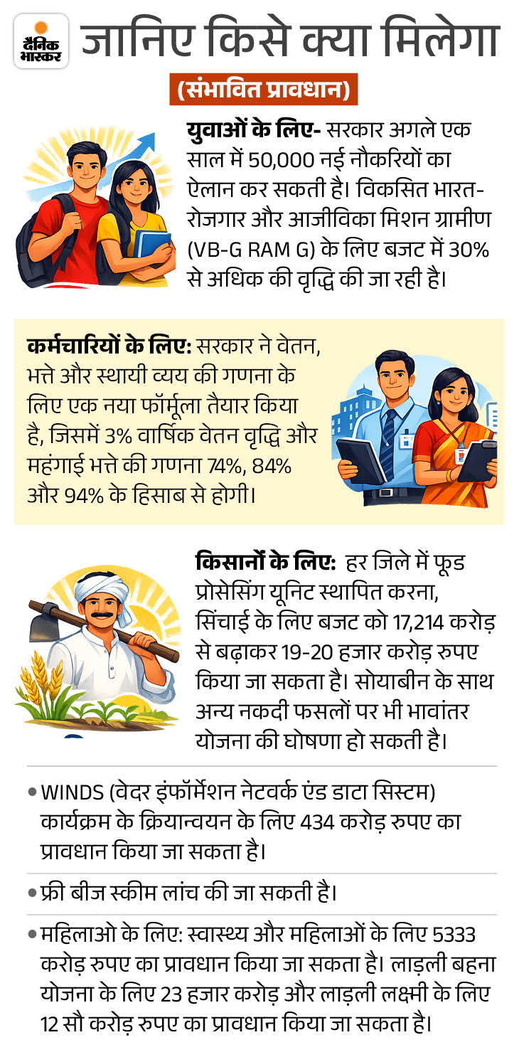 एमपी के युवाओं को सरकार से रोजगार, किसानों को सम्मान निधि और लाड़ली बहनों को योजना की राशि बढ़ने की उम्मीद है। वहीं, 2028 में होने वाले सिंहस्थ के ज्यादातर बड़े काम 2026-27 वित्तीय वर्ष में ही पूरे होने हैं। ऐसे में मोहन सरकार विशेष प्रावधान कर सकती है।