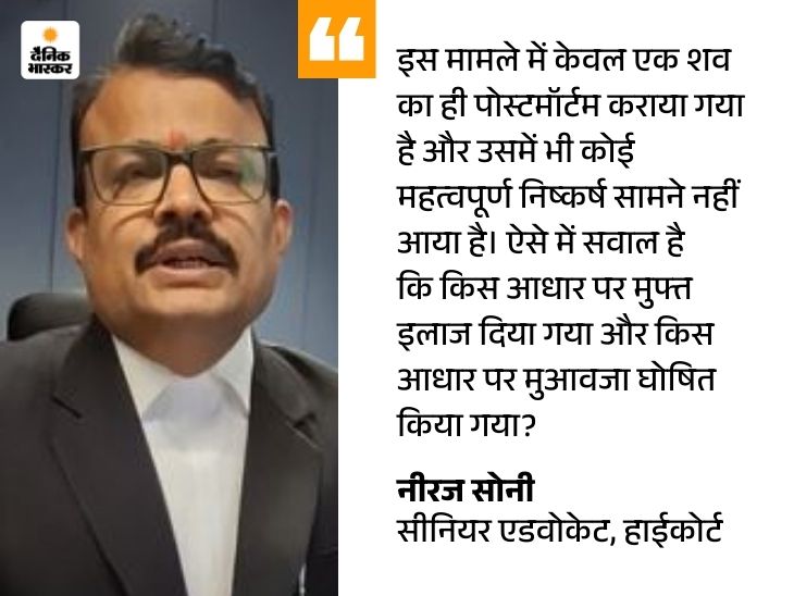 नीरज सोनी (सीनियर एडवोकेट, हाईकोर्ट) के मुताबिक, इस मामले में हाईकोर्ट में दायर जनहित याचिकाओं की सुनवाई के दौरान शासन ने अपना पक्ष रखते हुए इसे महामारी घोषित किया है। ऐसे में सवाल उठता है कि जब सरकार ने कोरोना को महामारी घोषित किया था, तब उससे हुई मौतों के मामलों में संबंधित शवों का पोस्टमॉर्टम कराया गया था। ऐसे में भागीरथपुरा में जो मौतें हुई हैं, उनका पोस्टमॉर्टम इस आधार पर कराया जाना चाहिए था कि वे असामान्य मौतें हैं।