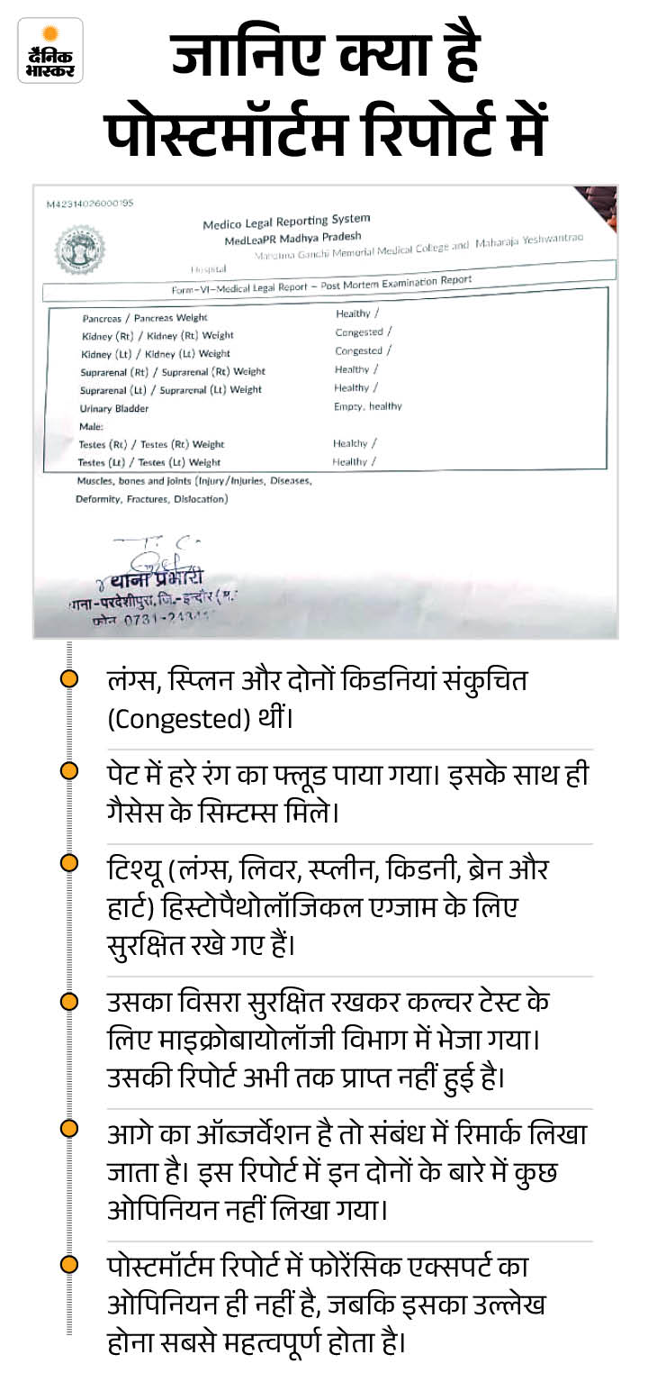 इसी बीच इस गंभीर प्रकरण में जिन 35 मृतकों में से केवल एक युवक का पोस्टमॉर्टम कराया गया था, उसकी रिपोर्ट ‘दैनिक भास्कर’ को मिली है। चौंकाने वाली बात यह है कि इस रिपोर्ट में भी फोरेंसिक विशेषज्ञ ने मौत का कारण (ओपिनियन) दर्ज नहीं किया है।
