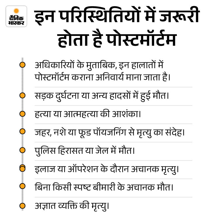 कानूनविदों के मुताबिक, किसी भी व्यक्ति की मौत यदि सामान्य परिस्थितियों में न होकर संदिग्ध या अप्राकृतिक हालात में होती है, तो उसके वास्तविक कारणों का खुलासा करने के लिए पोस्टमॉर्टम किया जाता है। यह एक चिकित्सीय और कानूनी प्रक्रिया है, जो मृत्यु के पीछे की सच्चाई सामने लाने में निर्णायक भूमिका निभाती है।