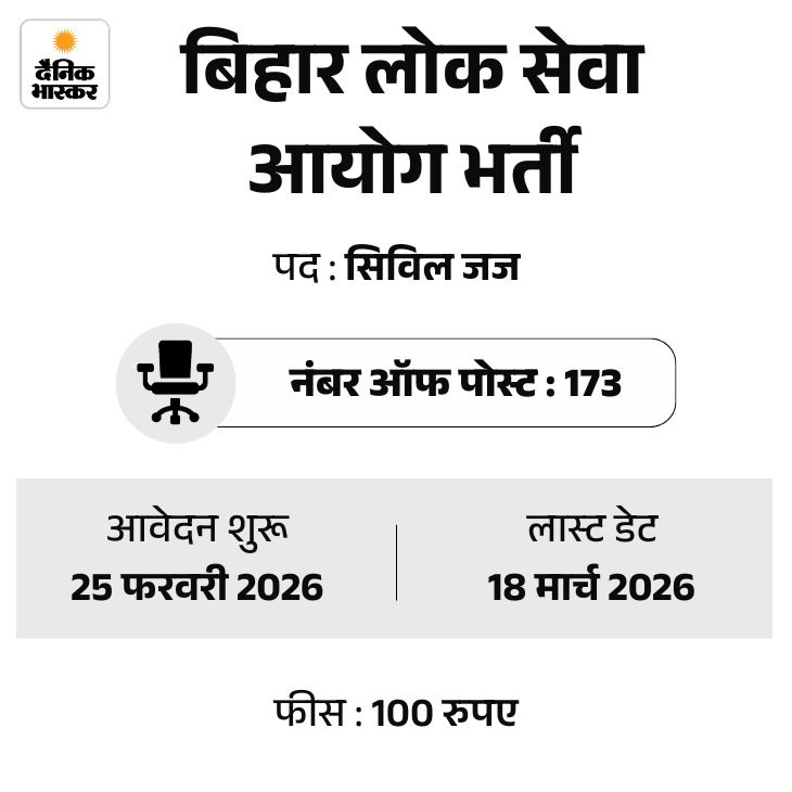 बिहार लोक सेवा आयोग (BPSC) सिविल जज पीसीएस जे परीक्षा 2026 का नोटिफिकेशन जारी किया है। इस भर्ती के लिए आवेदन की प्रक्रिया 25 फरवरी से शुरू होगी। उम्मीदवार ऑफिशियल वेबसाइट bpsc.bihar.gov.in पर जाकर आवेदन कर सकेंगे। फीस जमा करने की आखिरी तारीख भी 25 मार्च तय की गई है।