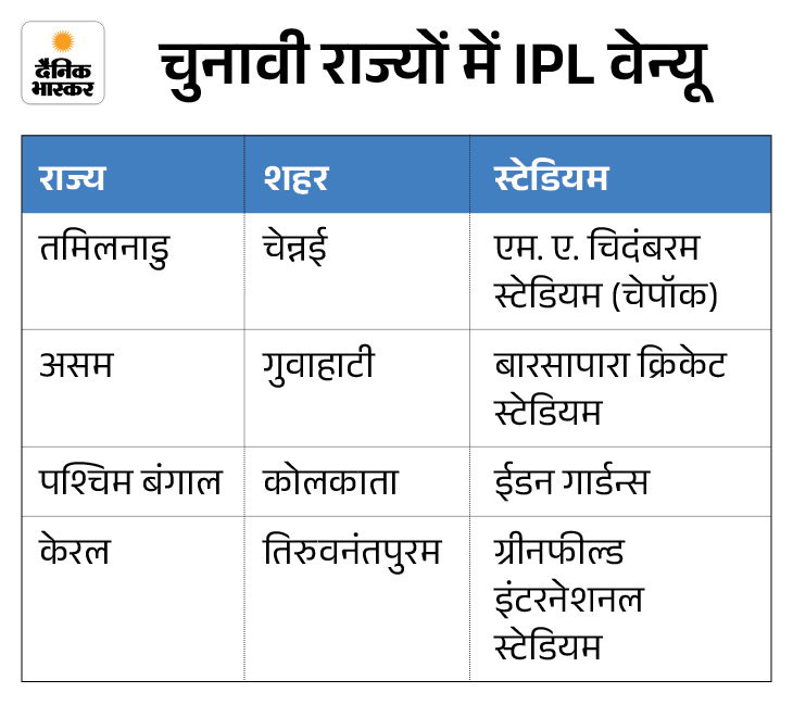 विधानसभा चुनाव वाले राज्यों में तीन ऐसे प्रमुख स्टेडियम हैं जो IPL वेन्यू के रूप में इस्तेमाल होते रहे हैं। तमिलनाडु के चेन्नई स्थित एम. ए. चिदंबरम स्टेडियम (चेपॉक) चेन्नई सुपर किंग्स का होम ग्राउंड है।