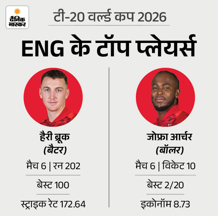 आर्चर इग्लैंड के टॅाप विकेट टेकर इंग्लैड के लिए हैरी ब्रूक ने इस टूर्नामेंट में सबसे ज्यादा रन बनाए हैं। उन्होंने 6 मैचों में 172.64 स्ट्राइक रेट से 202 रन बनाए। उनका बेस्ट स्कोर 100 रन रहा। वहीं, जोफ्रा आर्चर इंग्लैड के लिए टॅाप विकेट टेकर रहे। उन्होंने 6 मैचों में महज 8.73 की इकोनॅामी से 10 विकेट लिए।