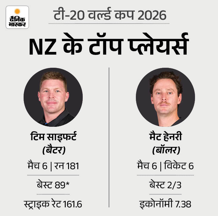 साइफर्ट न्यूजीलैंड के टॅाप बैटर टिम साइफर्ट ने टूर्नामेंट में न्यूजीलैंड के लिए सबसे ज्यादा रन बनाए हैं। उन्होंने 6 मैचों 161.6 की स्ट्राइक रेट से 181 रन बनाए। एक पारी में उनका बेस्ट नाबाद 89 रन रहा। वहीं, गेंदबाजी में मैट हेनरी टीम के लिए टॅाप विकेट टेकर रहे। उन्होंने 6 मैचों में 7.38 की इकोनॅामी से रन खर्च करते हुए 6 विकेट हासिल किए।