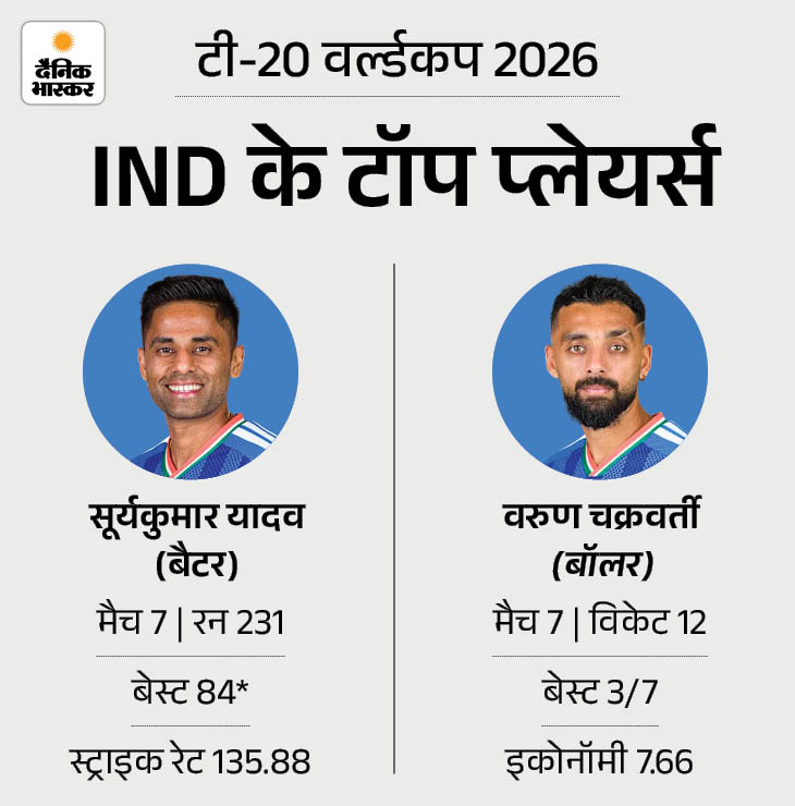 इस टी-20 वर्ल्ड कप में भारत के लिए सूर्यकुमार यादव शानदार फॉर्म में नजर आए हैं। उन्होंने 7 मैचों में 231 रन बनाए हैं, जिसमें उनका बेस्ट स्कोर 84* रहा है। गेंदबाजी में वरुण चक्रवर्ती ने बेहतरीन प्रदर्शन किया है। उन्होंने 7 मैचों में 12 विकेट झटके हैं।