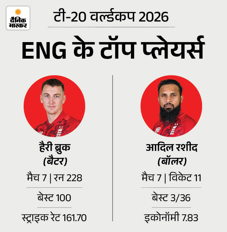 इस टी-20 वर्ल्ड कप में इंग्लैंड के लिए हैरी ब्रुक बल्ले से सबसे प्रभावशाली खिलाड़ियों में रहे हैं। उन्होंने 7 मैचों में 228 रन बनाए हैं। बॉलिंग डिपार्टमेंट में आदिल रशीद ने अहम भूमिका निभाई है। उन्होंने 7 मुकाबलों में 11 विकेट अपने नाम किए।