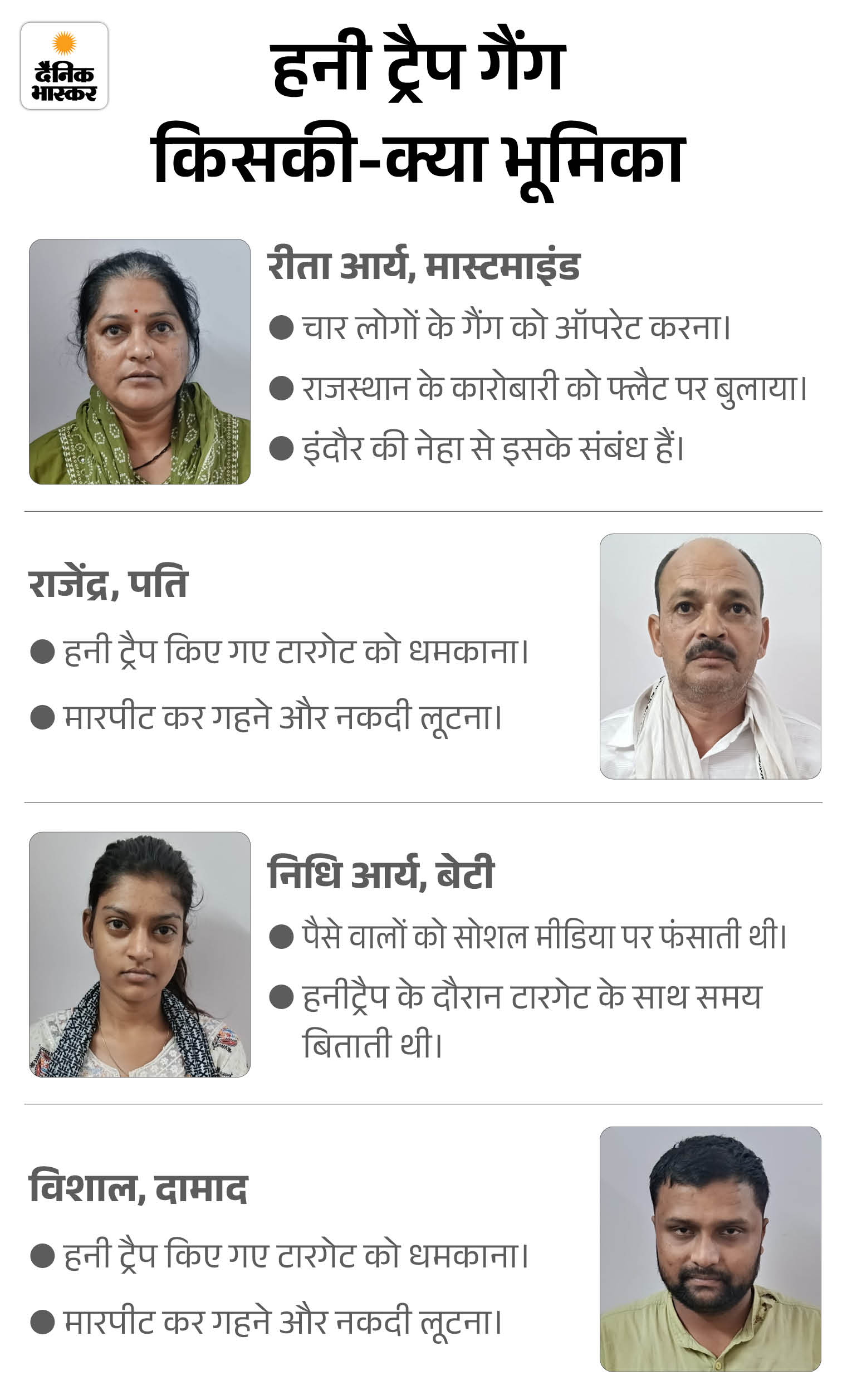 गिरोह से पूछताछ के बाद पड़ाव पुलिस ने आरोपियों को न्यायालय में पेश किया, जहां से उन्हें जेल भेज दिया गया। हनी ट्रैप गिरोह की मुख्य सरगना महिला है। उसकी बेटी, दामाद और पति भी इस गिरोह में शामिल हैं। यह गैंग आज से नहीं, बल्कि कई सालों से इस धंधे में लिप्त है।