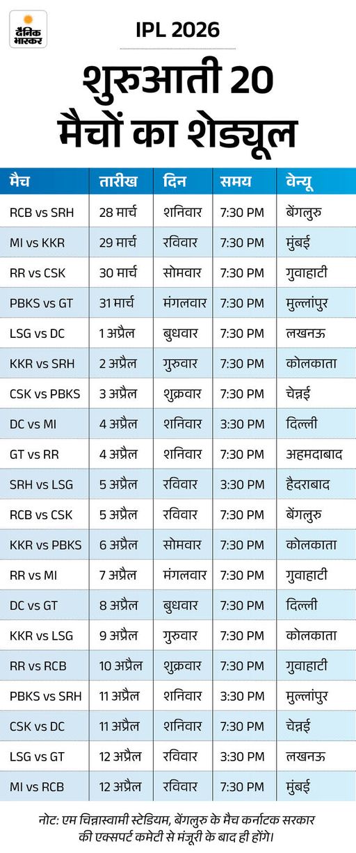 4 दिन पहले BCCI ने IPL के शुरुआती 20 मैचों का शेड्यूल जारी किया था। इनमें से 2 मैच बेंगलुरु के एम. चिन्नास्वामी स्टेडियम में होने हैं। शेड्यूल जारी करते समय BCCI ने कहा था कि बेंगलुरु में IPL मैच सरकार की परमीशन पर निर्भर करेंगे।