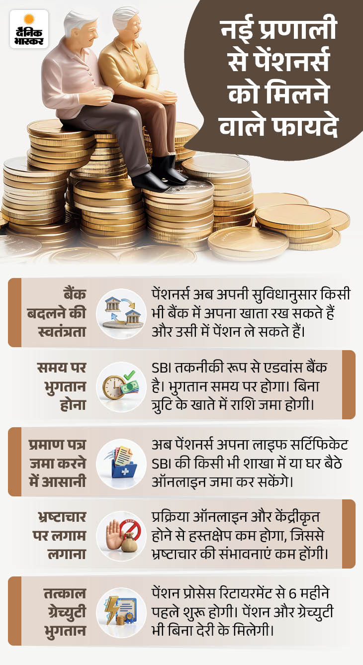 - पूरी प्रोसेस को सेंट्रलाइज्ड किया जा रहा है। राज्य सरकार पेंशन की पूरी राशि केवल भारतीय स्टेट बैंक (SBI) को हस्तांतरित करेगी, जिसमें राज्य सरकार का मुख्य खाता है।