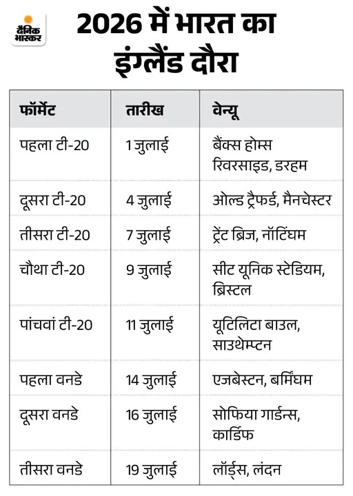 इंग्लैंड का भी दौरा करेगा भारत भारत इस साल इंग्लैंड का दौरा करेगा। दोनों टीमों के बीच आठ वाइट बॉल मैच खेले जाएंगे। भारत जुलाई में पांच टी-20 और तीन वनडे मैच खेलने के लिए इंग्लैंड दौरा करेगा।