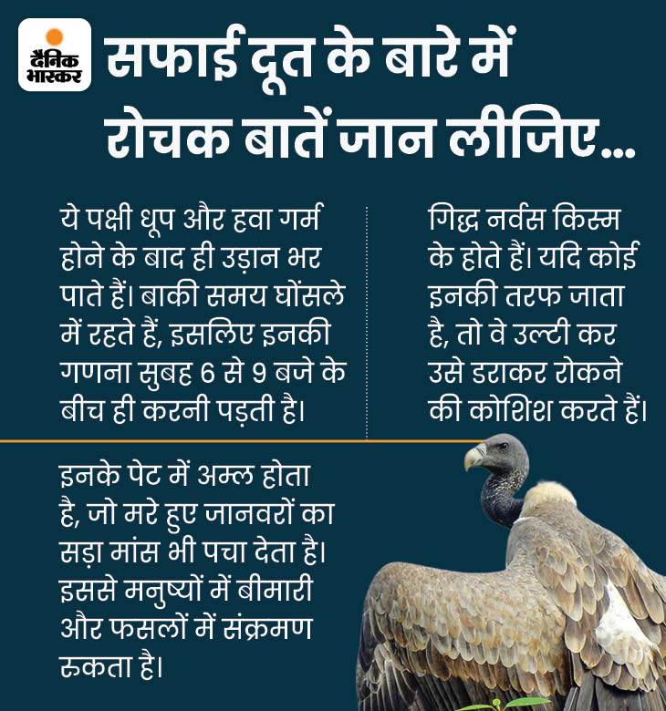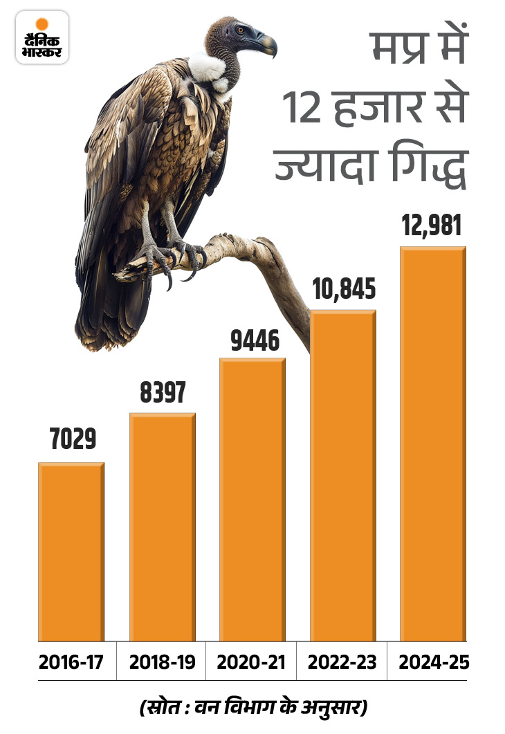 ये भी जानिए… प्रदेश में ऐसे बढ़ी गिद्धों की संख्या जानकारी के अनुसार, प्रदेश में गिद्धों की गणना की शुरुआत वर्ष 2016 से की गई थी। प्रदेश में गिद्धों की कुल 7 प्रजातियां पाई जाती हैं। इसमें से 4 प्रजातियां स्थानीय एवं 3 प्रजाति प्रवासी हैं। गिद्धों की गणना करने के लिए शीत ऋतु का अंतिम समय सही रहता है। इस दौरान स्थानीय एवं प्रवासी गिद्धों की गणना आसानी से हो जाती है। वर्ष 2019 की गणना में गिद्धों की संख्या 8 हजार 397, वर्ष 2021 में 9 हजार 446, वर्ष 2024 में 10 हजार 845 और 2025 में 12 हजार 981 हो गई थी। इस बार हुई गणना में यह संख्या 14 हजार से ज्यादा पहुंच सकती है।