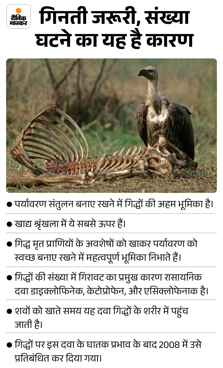 इसलिए कम हो गई थी गिद्धों की संख्या एक आंकड़े के अनुसार, वर्ष 1990 से 92 में भारत में 4 करोड़ गिद्ध थे। साल दर साल ये संख्या कम होती गई। पशुओं को दर्द, सूजन आदि के दौरान डायक्लोफेनाक दवा दी जाती है। इनके खाने के बाद मरने वाले पशु या जानवर का मांस गिद्ध खाते हैं। दवा के प्रभाव से गिद्धों की ज्यादा मौत हो जाती है। यह दवा प्रतिबंधित की गई है।