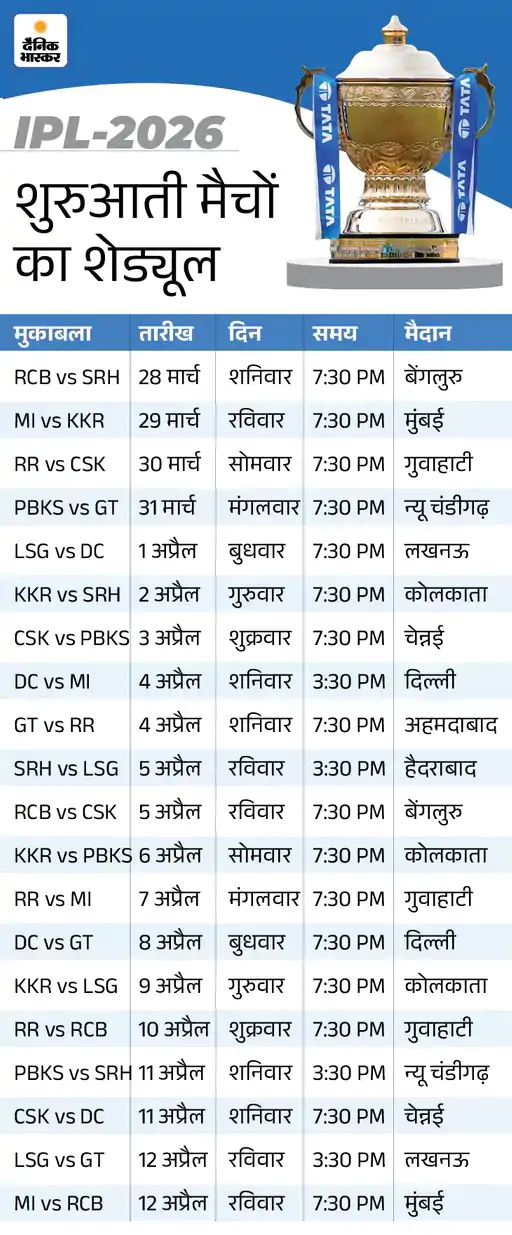 IPL 2026 सीजन की शुरुआत 28 मार्च से हो रही है। डिफेंडिंग चैंपियन RCB अपने घरेलू मैदान एम. चिन्नास्वामी स्टेडियम में सनराइजर्स हैदराबाद (SRH) के खिलाफ पहला मैच खेलेगी।