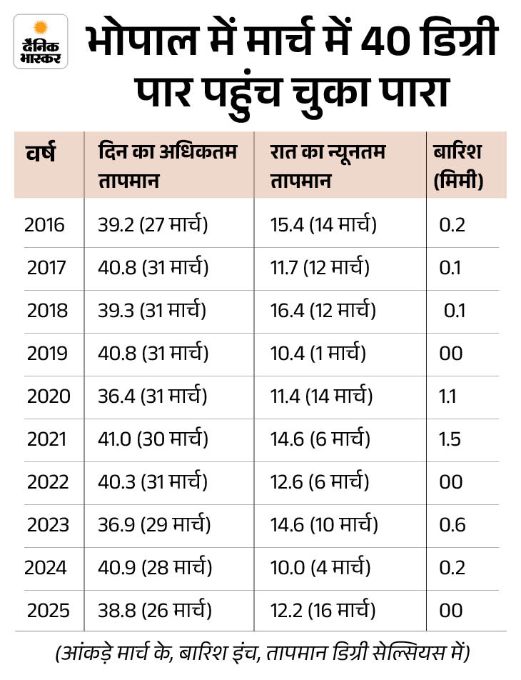 भोपाल में मार्च महीने में दिन में तेज गर्मी पड़ने के साथ बारिश का ट्रेंड भी है। मौसम विभाग के अनुसार, मार्च महीने में गर्मी के सीजन की शुरुआत हो जाती है। इसके चलते दिन-रात के तापमान में बढ़ोतरी होने लगती है। आंकड़ों पर नजर डालें तो 30 मार्च 2021 को अधिकतम तापमान रिकॉर्ड 41 डिग्री पहुंच चुका है।