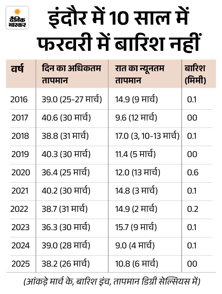 इंदौर में मार्च से गर्मी का असर तेज होने लगता है। यहां दिन का पारा 41.1 डिग्री तक पहुंच चुका है, जो 28 मार्च 1892 को दर्ज किया गया था। 4 मार्च 1898 को रात में पारा 5 डिग्री सेल्सियस तक रहा था।