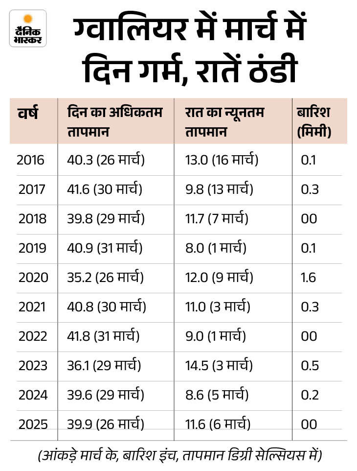 मार्च महीने में ग्वालियर में गर्मी, ठंड और बारिश तीनों का ही ट्रेंड है। 31 मार्च 2022 को दिन का पारा रिकॉर्ड 41.8 डिग्री पहुंच गया था, जबकि 1 मार्च 1972 की रात में न्यूनतम तापमान 5.4 डिग्री रिकॉर्ड हो चुका है। साल 2015 में पूरे महीने 5 इंच से ज्यादा पानी गिरा। वहीं, 12 मार्च 1915 को 24 घंटे में करीब 2 इंच बारिश हुई थी।