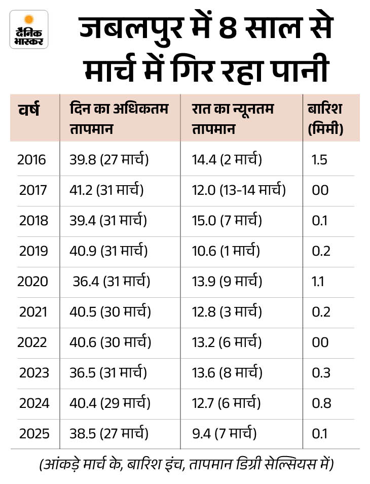 जबलपुर में मार्च में भी रातें ठंडी रहती हैं। पारा औसत 15 डिग्री के आसपास ही रहता है। वहीं, दिन में 36 से 40 डिग्री के बीच तापमान दर्ज किया जाता है। 31 मार्च 2017 को दिन का पारा 41.2 डिग्री सेल्सियस पहुंच चुका है, जबकि 4 मार्च 1898 में रात का तापमान 3.3 डिग्री दर्ज किया गया था। यहां मार्च में मावठा भी गिरता है। पिछले 10 में से 9 साल बारिश हो चुकी है।