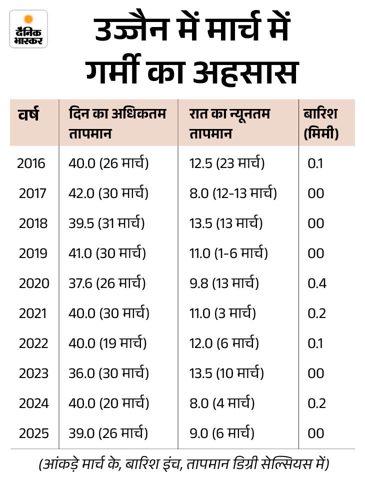 उज्जैन में दिन रहते हैं गर्म, 6 दिन बारिश का ट्रेंड भी उज्जैन में दिन गर्म रहते हैं। 22 मार्च 2010 को पारा रिकॉर्ड 42.5 डिग्री सेल्सियस पहुंच चुका है। वहीं, 1 मार्च 1971 की रात में न्यूनतम तापमान 4.6 डिग्री रहा था। पिछले साल दिन में तापमान 36 से 42 डिग्री सेल्सियस के बीच रहा है। उज्जैन में 2017 सबसे गर्म साल रहा था। मौसम विभाग के अनुसार, इस महीने बारिश भी होती है। एक दिन में पौने 2 इंच बारिश का रिकॉर्ड 17 मार्च 2013 का है।