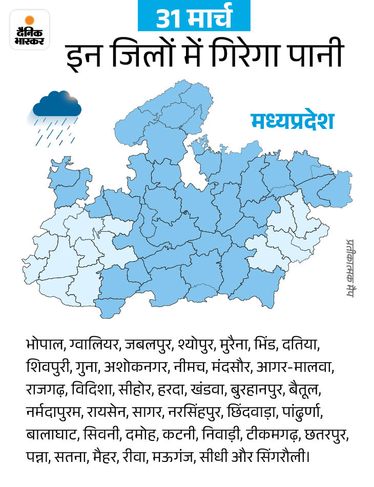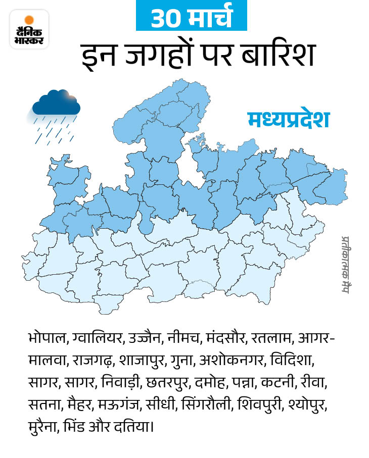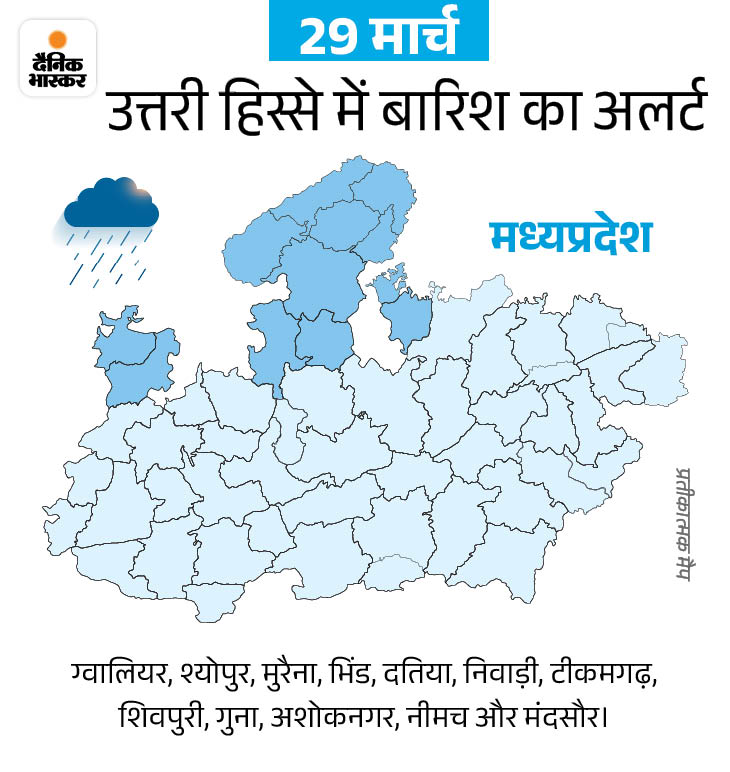 भोपाल-उज्जैन में भी बारिश का अनुमान मौसम विभाग के अनुसार, 31 मार्च तक भोपाल, इंदौर, उज्जैन, ग्वालियर, चंबल, सागर संभाग के करीब 40 जिलों में पानी गिर सकता है। 29 मार्च को कुछ जिलों में बूंदाबांदी होने का अनुमान है। 30 और 31 मार्च को सिस्टम का सबसे ज्यादा असर रहेगा।