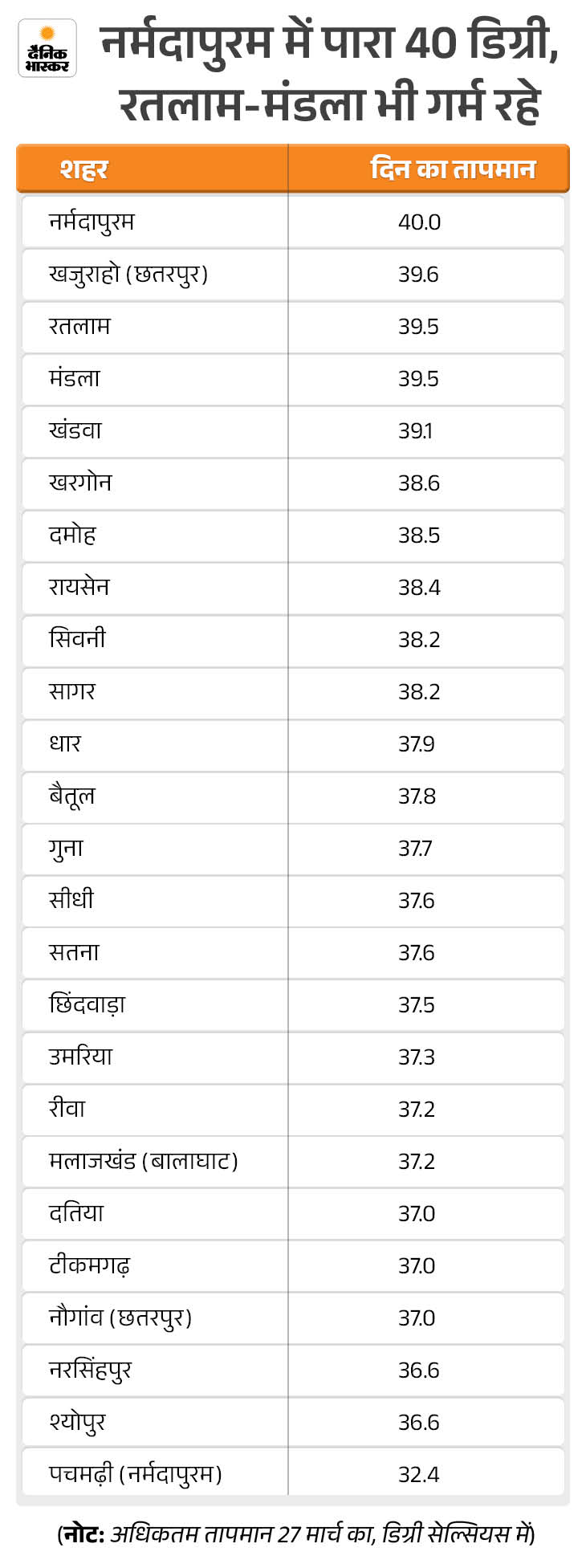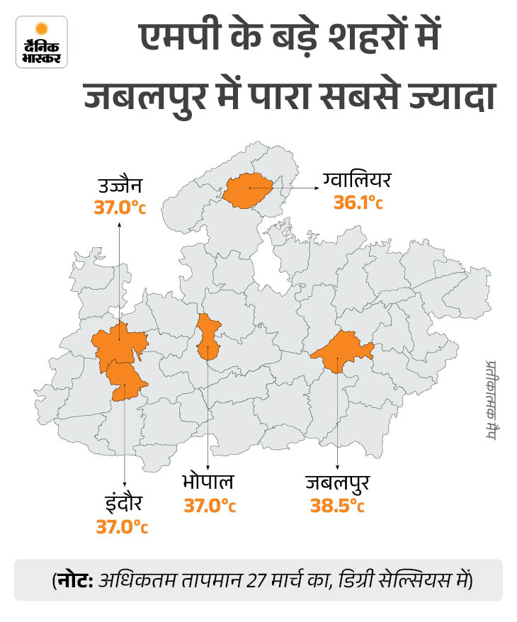 वहीं, प्रदेश के 5 बड़े शहरों में जबलपुर में सबसे ज्यादा 38.2 डिग्री सेल्सियस दर्ज किया गया। भोपाल, इंदौर और उज्जैन में तापमान 37 डिग्री पहुंच गया, जबकि ग्वालियर में 36.1 डिग्री रहा।