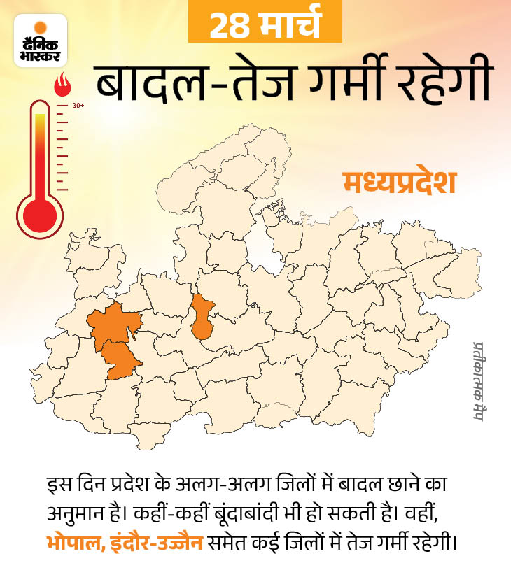 मध्य प्रदेश में 29 मार्च से आंधी-बारिश का दूसरा स्ट्रॉन्ग सिस्टम एक्टिव हो रहा है। इस सिस्टम का असर लगातार 3 दिन तक रहेगा और भोपाल, उज्जैन, ग्वालियर-जबलपुर समेत प्रदेश के करीब 40 जिलों में बारिश का अलर्ट है। हालांकि, शनिवार को प्रदेश में तेज गर्मी रह